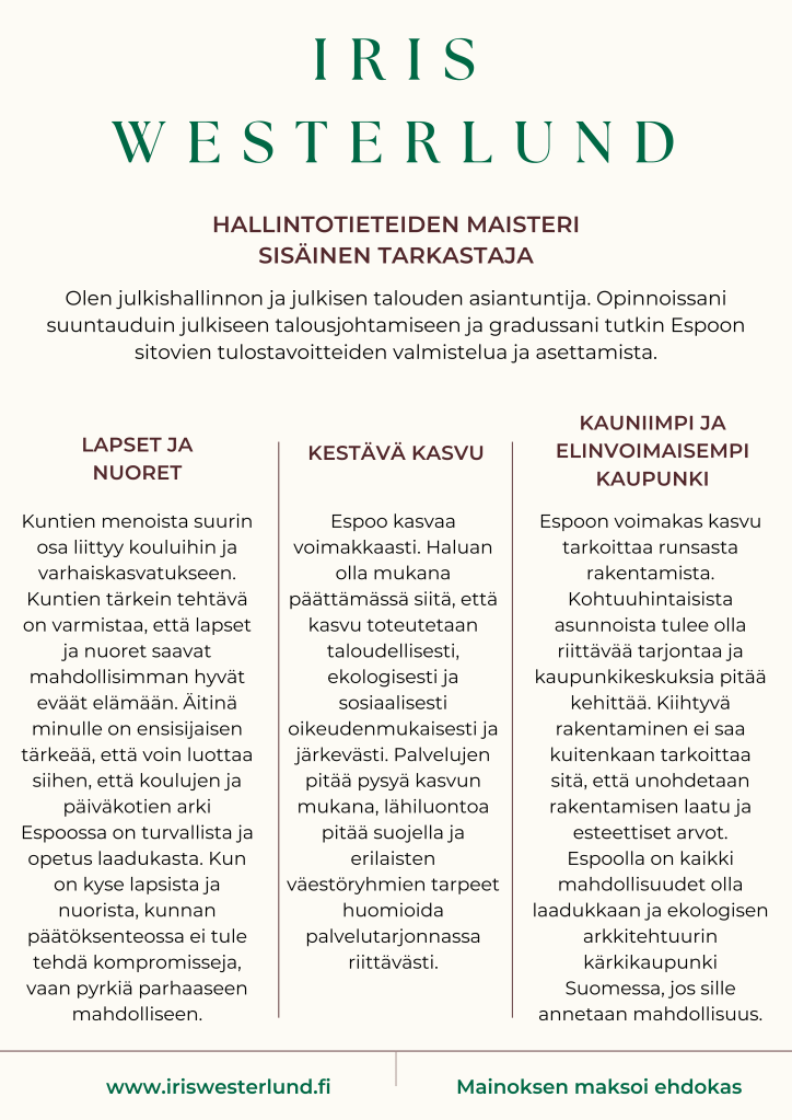 Nuorena en ajatellut lähteväni mukaan politiikkaan, mutta kun minua reilu kymmenen vuotta sitten kysyttiin mukaan Espoon vihreiden nuorten hallitukseen, päätin sanoa kyllä. Vuonna 2017 olin ensimmäisen kerran ehdokkaana kuntavaaleissa ja vaikka kampanjani oli lähes olematon, pääsin varavaltuutetuksi ja sain paikan Espoon tarkastuslautakunnasta, jossa toimin varsinaisena jäsenenä valtuustokauden 2017–2021. Vuonna 2019 toimin lisäksi Espoon Vihreiden Naisten hallituksen puheenjohtajana sekä olin ehdokkaana eduskuntavaaleissa. Nyt, muutaman vuoden tauon jälkeen, halusin lähteä jälleen ehdokkaaksi kuntavaaleihin tavoittelemaan tosissani paikkaa Espoon kaupunginvaltuustossa.
